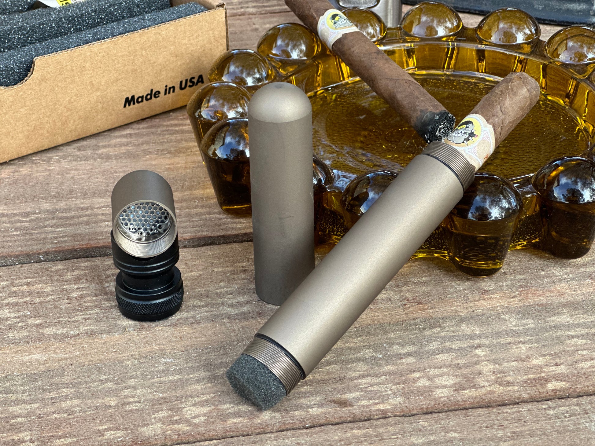 Each Stogie Pipe is meticulously crafted in Southern California and features a patented humidor built into the cylinders. This innovative design ensures that your cigars are maintained at a consistent 70% humidity level, regardless of the external conditions. As a result, your cigars remain soft and easy to smoke, delivering an unparalleled smoking experience. Constructed from 100% US-grade Aluminum Alloy, our pipes are anodized inside and out to prevent any metallic flavors from interfering with the natural taste of your cigar.