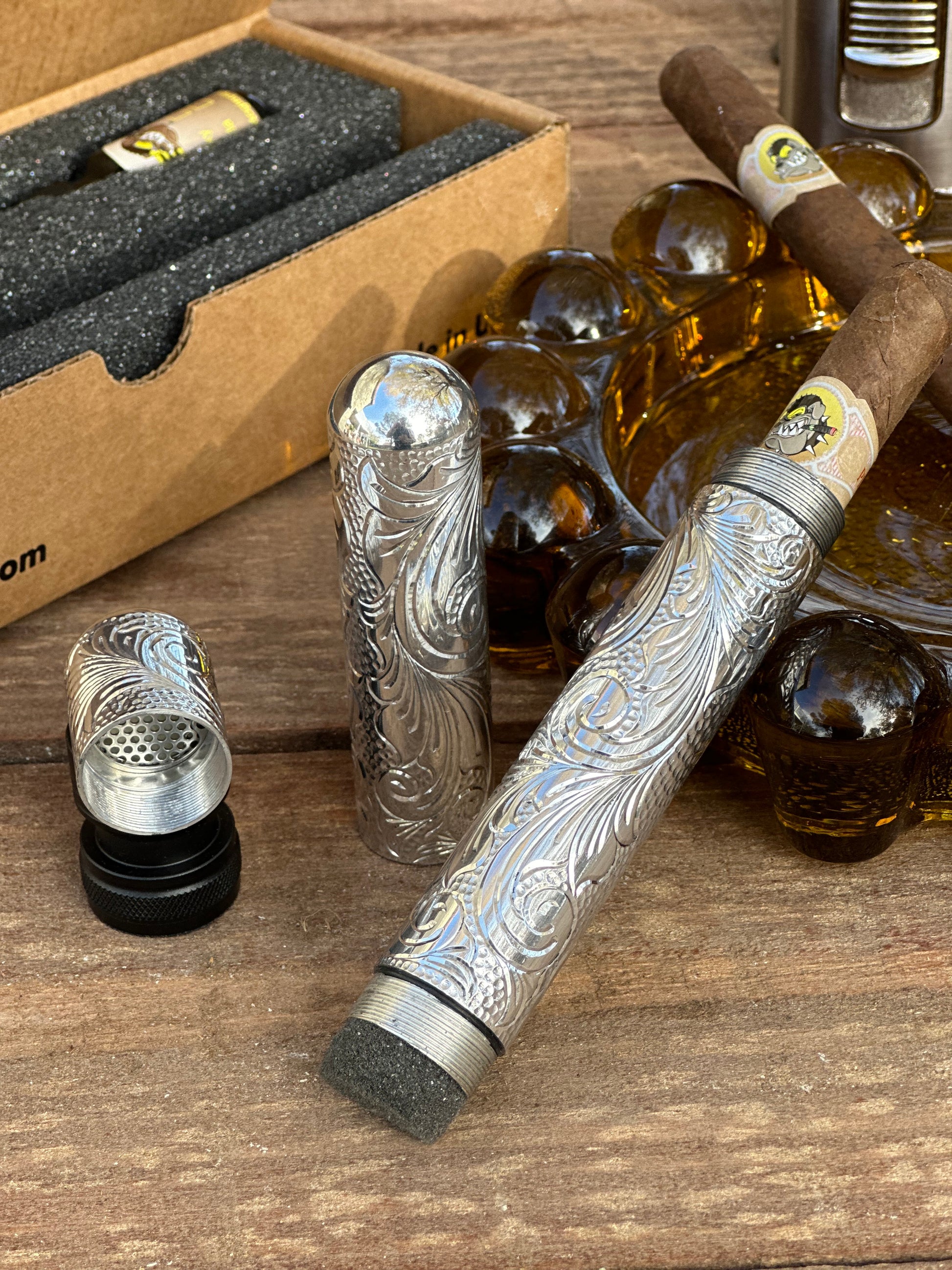 Each Stogie Pipe is meticulously crafted in Southern California and features a patented humidor built into the cylinders. This innovative design ensures that your cigars are maintained at a consistent 70% humidity level, regardless of the external conditions. As a result, your cigars remain soft and easy to smoke, delivering an unparalleled smoking experience. Constructed from 100% US-grade Aluminum Alloy, our pipes are anodized inside and out to prevent any metallic flavors from interfering with the natural taste of your cigar.